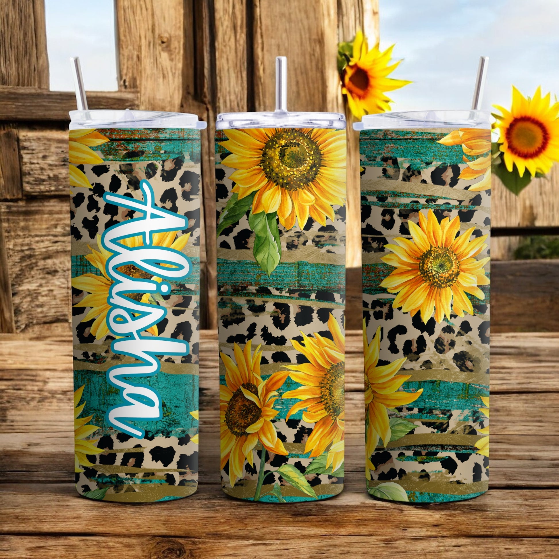 Alegra tu día con nuestro vaso delgado de 20 onzas, adornado con un alegre diseño de girasol. Perfecto para mantener tus bebidas calientes o frías, y puedes personalizarlo con tu nombre para darle un toque especial. 🌞✨