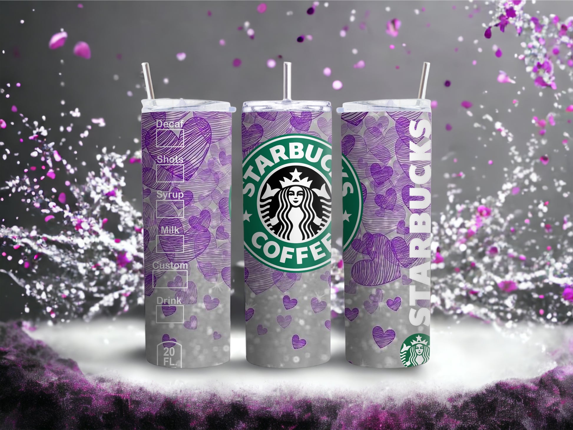 ¡Disfruta de un trago con estilo con nuestro vaso floral morado y plateado inspirado en Starbucks! Adopta la elegancia de las flores vibrantes sobre un fondo azul marino elegante, que recuerda la estética de tu cafetería favorita. Este llamativo vaso no es solo un accesorio para bebidas; es una declaración de moda. Mejora tus tragos diarios y agrega un toque de estilo romántico a tu rutina. ¡No es solo un vaso; es una experiencia amorosa en cada taza!