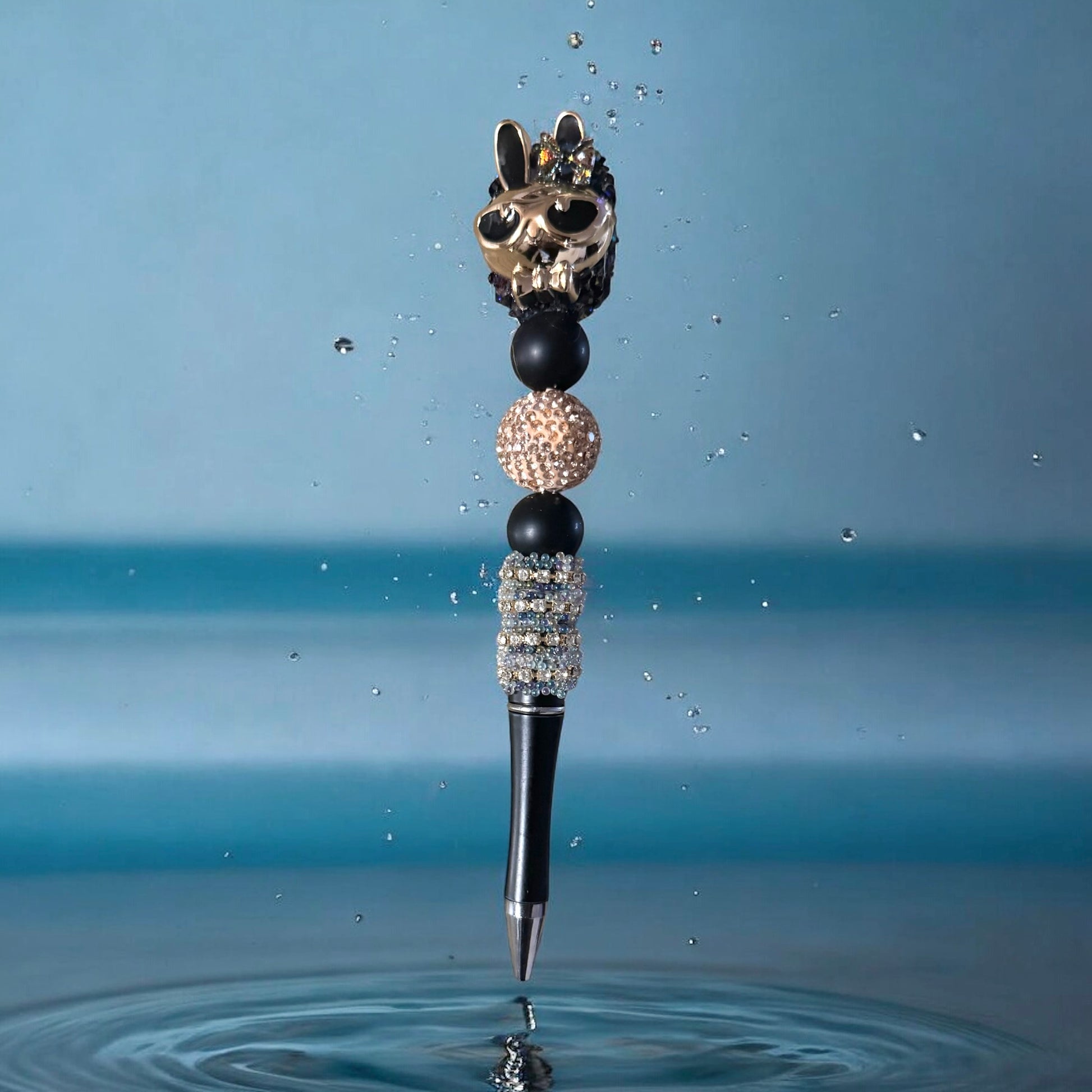 The Skull-Themed Bling Refillable Pen is a bold and stylish writing accessory for those who love to stand out. Featuring a unique skull topper and adorned with sparkling beads and rhinestones, this pen is perfect for making a statement. With its refillable design, you can enjoy a long-lasting, luxury writing experience. Ideal for note-taking, journaling, or as a striking gift, this bling pen is the ultimate combination of edge and class
